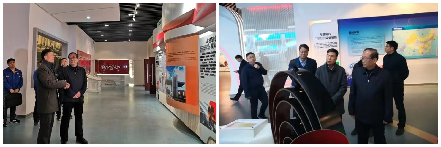 座談交流前,嚴(yán)董事長(zhǎng)一行在舒高新等領(lǐng)導(dǎo)陪同下,參觀了寶雞鋼管展覽大廳、輸送管公司三分廠、西安專用管寶雞工廠管加工車間。