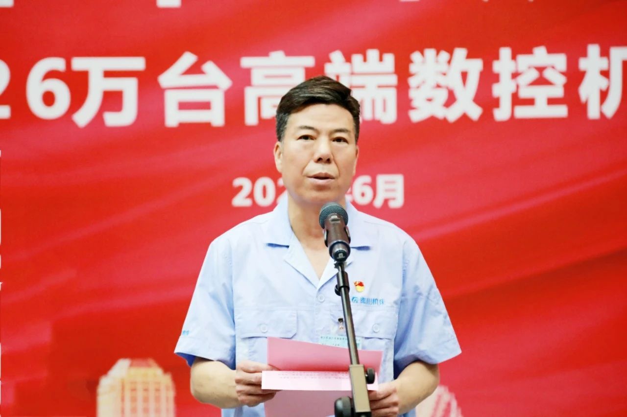 嚴(yán)鑒鉑代表集團(tuán)對(duì)第26萬(wàn)臺(tái)高端數(shù)控機(jī)床順利下線表示熱烈祝賀!向日夜奮戰(zhàn)在生產(chǎn)一線的集團(tuán)全體員工致以崇高的敬意!